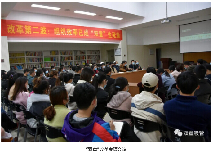 2020年4月2日,“雙童”推動企業(yè)第二波改革活動,提出“組織效率已成雙童生死劫”!在改革動員大會中,樓仲平一再強調(diào):“‘雙童’不是你的家、沒有‘動力’請回家!”