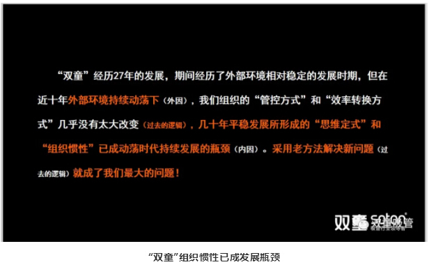 此外,我們還認識到,疫情危機后,外部環(huán)境的動蕩性將持續(xù)加劇,過去的邏輯對未來逐漸失效,“雙童”幾十年平穩(wěn)發(fā)展所形成的“組織慣性”已經成為了持續(xù)發(fā)展的瓶頸,因此,“雙童”積極推動組織做出改變。