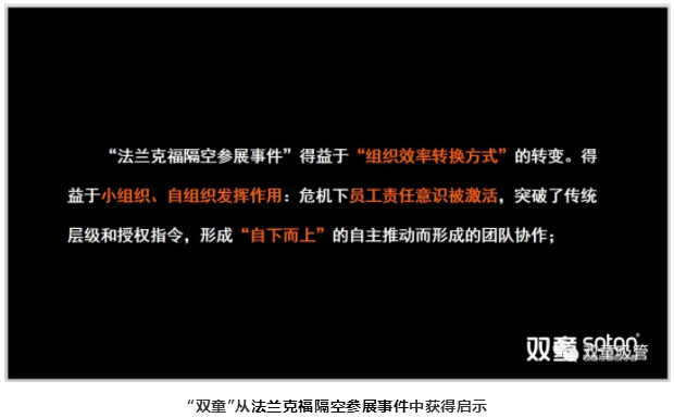在這個過程中,組織效率發(fā)生了轉變,從以往的“要你做”,變成了現(xiàn)在的“我要做”,突破了指令的授權,實現(xiàn)了團隊的協(xié)作。可以說如果“雙童”沒有進行組織轉變,這樣的事情就不太可能發(fā)生。