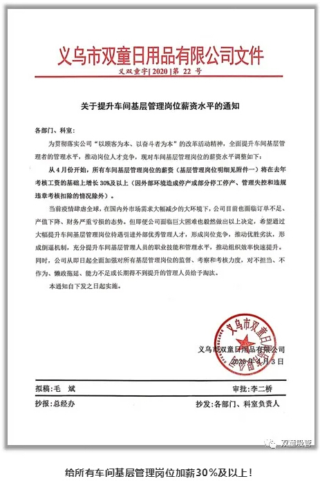 不僅如此,”雙童”在第二波改革推進過程當(dāng)中,明確給所有車間基層管理崗位加薪30%及以上,目的是為了吸引外部優(yōu)秀的生產(chǎn)管理人才進入,形成倒逼機制,推動崗位競爭,解決組織效率低下、團隊老化的問題,實現(xiàn)優(yōu)勝劣汰,從而讓用心做事的人得益,讓追求結(jié)果的奮斗者得到彰顯!