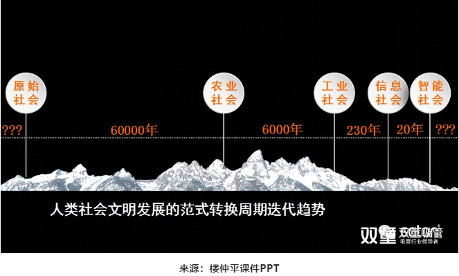 從這頁(yè)PPT中,我們可以看到,人類(lèi)從原始社會(huì)過(guò)渡到農(nóng)業(yè)社會(huì),經(jīng)歷了60000年;從農(nóng)業(yè)社會(huì)過(guò)渡到工業(yè)社會(huì),經(jīng)歷了6000年;從工業(yè)社會(huì)過(guò)渡到信息社會(huì),經(jīng)歷了230年;而從信息社會(huì)過(guò)渡到智能社會(huì),人類(lèi)僅僅需要20年。這說(shuō)明在人類(lèi)社會(huì)文明發(fā)展的過(guò)程中,范式轉(zhuǎn)換的周期變得越來(lái)越短。