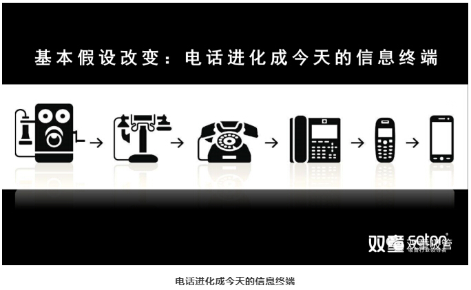 從最初語(yǔ)音傳播的工具到互聯(lián)網(wǎng)信息的主要傳播工具,電話的演變過(guò)程不正是工業(yè)化范式向互聯(lián)網(wǎng)范式的轉(zhuǎn)換嗎?如果你還認(rèn)為電話僅僅是用來(lái)語(yǔ)音傳播的,那它一定會(huì)成為你的絆腳石。