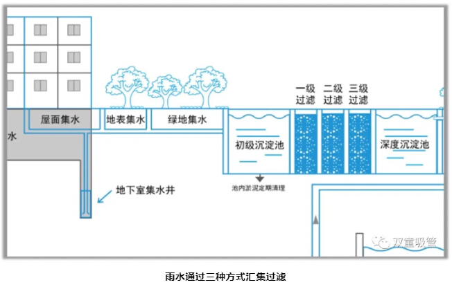 秘訣就是在屋頂、路面、綠化帶中做好雨水收集點,用地下管道把它們連成一個整體,經(jīng)過科學過濾,匯集到一個總裝水容量2000多噸的雨水收集池。