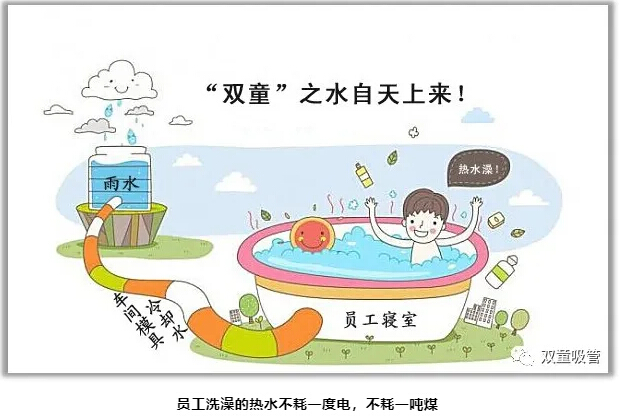 最神奇的是,“雙童”員工洗澡的熱水不耗一度電,不耗一噸煤,全部是收集好的雨水經(jīng)車間模具冷卻后形成的余熱水哦!