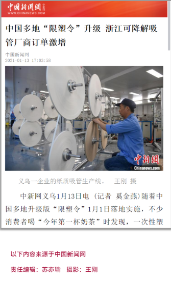 1月13日,中國新聞網刊登了一篇關于“雙童吸管”報道。在“禁塑令”升級廣泛推行之際,“雙童”環(huán)保吸管受到社會各界廣泛的關注。下面就跟著吸管妞一起去看看吧!