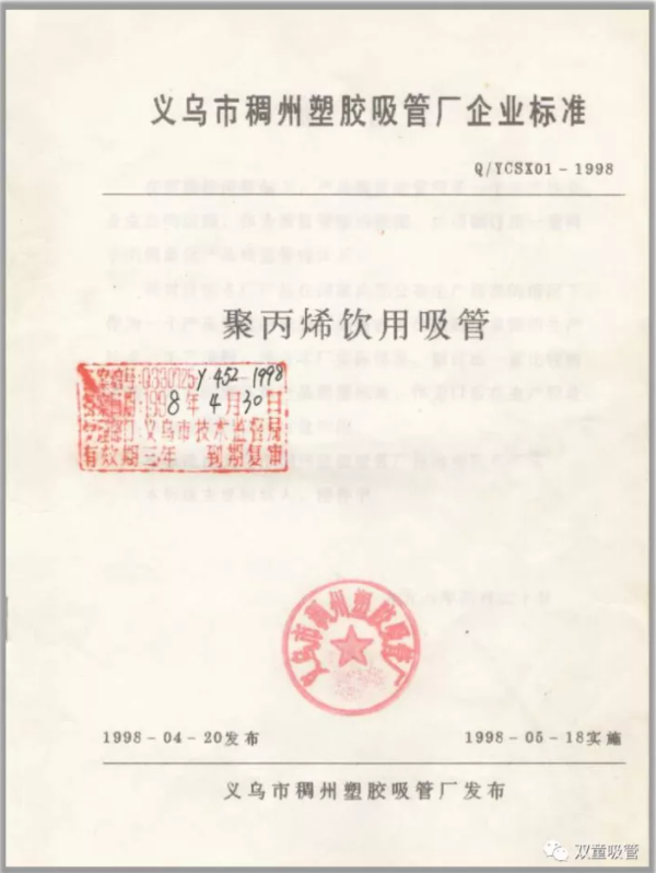 這個(gè)看似有點(diǎn)“降維打擊”意思的舉措,卻源于該公司董事長樓仲平對一次偶然事件的思考。1997年以前,整個(gè)國內(nèi)吸管行業(yè)沒有產(chǎn)品標(biāo)準(zhǔn)可言,所有吸管產(chǎn)品都是無標(biāo)生產(chǎn)。當(dāng)時(shí),樓仲平的日本友人桑原道昭先生介紹了陸家嘴八佰伴超市的社長到“雙童”采購吸管,卻發(fā)現(xiàn)“雙童”根本做不了超市的產(chǎn)品?!八羞M(jìn)入主流超市的產(chǎn)品都需要在包裝上有條形碼。如果要申請產(chǎn)品條形碼,企業(yè)必須要制定相關(guān)產(chǎn)品的企業(yè)標(biāo)準(zhǔn)?!睒侵倨揭庾R到,若沒有企業(yè)標(biāo)準(zhǔn)就無法進(jìn)入到主流高端市場,于是他就下決心開始制定企業(yè)的產(chǎn)品標(biāo)準(zhǔn)。終于在1997年10月,由“雙童”前身的義烏市稠州塑膠吸管廠起草的《聚丙烯飲用吸管》企業(yè)標(biāo)準(zhǔn)順利通過審核,于1998年4月正式發(fā)布,成為吸管行業(yè)最早的產(chǎn)品標(biāo)準(zhǔn)。從此,“雙童”打開了產(chǎn)品在商超場所的銷售渠道,實(shí)現(xiàn)了傳統(tǒng)家庭作坊企業(yè)向正規(guī)工廠的轉(zhuǎn)型。