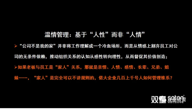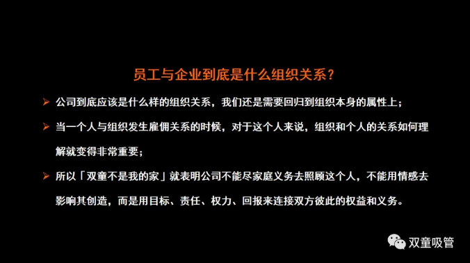 需要強(qiáng)調(diào)的是,我們推行“雙童不是你的家”,并非是將“雙童”營造成一個(gè)冷血場(chǎng)所,而是讓員工從情感上割棄對(duì)公司的無條件依賴,將對(duì)組織的認(rèn)知從感性轉(zhuǎn)向理性,運(yùn)用職業(yè)化思維引導(dǎo)員工價(jià)值創(chuàng)造。