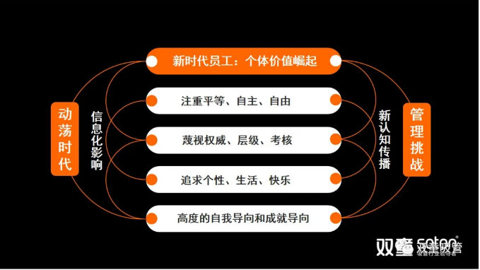 同時(shí),大量在互聯(lián)網(wǎng)信息時(shí)代下成長起來的90后、00后員工進(jìn)入工作崗位。他們的思維與以往的老一代有所不同:他們有著高度的自我導(dǎo)向和成就導(dǎo)向,更加注重平等、自主和自由,蔑視權(quán)威、層級(jí)和考核。這表示我們進(jìn)入了一個(gè)體價(jià)值的崛起的時(shí)代。