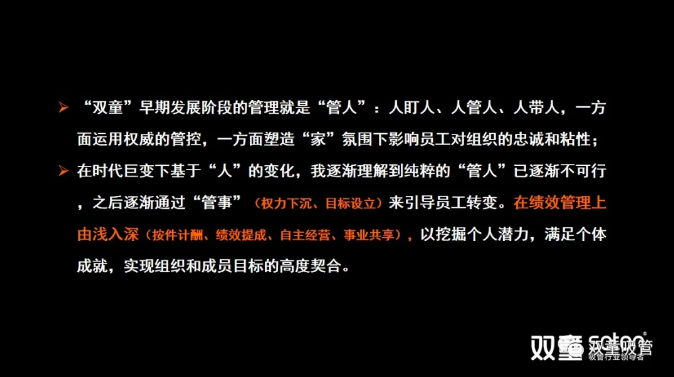 “雙童”在以往的管理形式上采取“管人”的模式,各項(xiàng)事務(wù)都通過層級(jí)指令、管控執(zhí)行。在時(shí)代巨變下,基于“人”的變化,我們理解到純粹的“管人”已逐漸不可行。