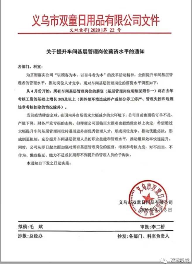 給所有車間基層管理崗位加薪30%及以上!