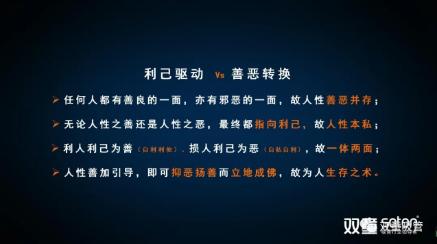 從上圖中大家可以看到,無論人性之善還是人性之惡,其實都包含“利己驅(qū)動”。“利己”是人在長期的自然環(huán)境中為了獲得生存不得不獲得更多外部資源的內(nèi)在驅(qū)動力,從而導(dǎo)致人總是會從利己的角度去考慮如何更快、更多的獲得。所以“人性本私”是無可非議的。