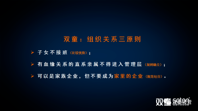 雙童在組織變革后明確形成了“組織關(guān)系三原則”,很多人不理解樓老師在十年前做出的“子女不接班”這樣的傳承安排,樓老師引導(dǎo)大家在傳承問題上沒有絕對的答案,雙童不讓子女接班并非我大公無私,而是運用經(jīng)濟學(xué)的“比較優(yōu)勢”原理充分酌量后選擇的結(jié)果,是綜合考慮了子女的喜好、擅長、愿景后而得出的合理安排。當(dāng)然期間隱含的信號卻發(fā)出了巨大的想象空間。大家想想,在一家經(jīng)營了近二十年的傳統(tǒng)制造企業(yè)里面: