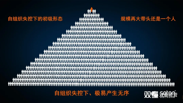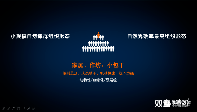 樓老師通過蟻群、猴群、魚群等自然界案例和思維邏輯圖,向大家展現(xiàn)了自然界當(dāng)中普遍存在的自然組織形態(tài)。這種基于動物性、血緣化本能而形成的雙層結(jié)構(gòu)的組織形式由于其編制靈活、人員精干、機動快速而戰(zhàn)斗力強,是自然界當(dāng)中存在億萬年之久的十分高效的組織形態(tài)。