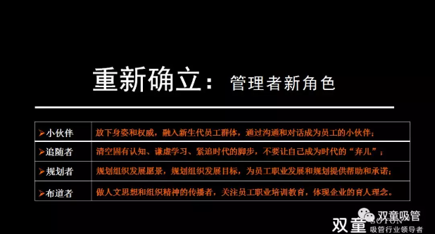 最后樓老師針對上述組織變革提出了管理者角色的重新定位,他認為傳統(tǒng)經(jīng)營者和管理者如果還在堅持沿用以前的老經(jīng)驗、老方式,那就離淘汰不遠了!樓老師也再次提醒大家,面對不同的價值個體,管理者首先需要改變的就是自己: