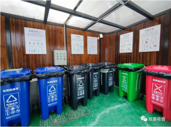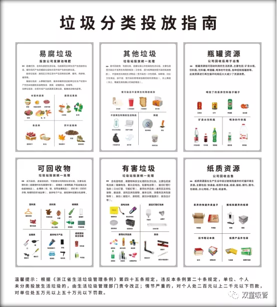 在“雙童”的垃圾投放房里各有紅綠藍(lán)黑等多個(gè)顏色的垃圾分類桶,分別將廠區(qū)的生活垃圾分為了易腐垃圾、其他垃圾、可回收物、有害垃圾四大類。如果你仔細(xì)觀察,就會(huì)發(fā)現(xiàn)“雙童”的投放指南上,還對可回收物中的紙張資源和瓶罐資源進(jìn)行了細(xì)分。