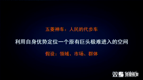 那么它運用的是什么原理呢?大家不妨思考一下! 是升維拆解嗎?顯然不是!這實際上是通過假設挖掘出一個更為底層的主流消費群體,滿足了大眾更為廣泛的需求,從而在原有市場之外找到了自己的生態(tài)位,建立起自身獨特的創(chuàng)新模式,那么這種模式就是“降維拆解”。 所以,五菱宏光MINI電動車的廣告詞非常精準,叫做“人民的代步車”,人民就是它的認知前提,代步車是它的產(chǎn)品消費定位群體,利用自身優(yōu)勢定位一個原有巨頭極難進入的空間,從而打開新的市場。
