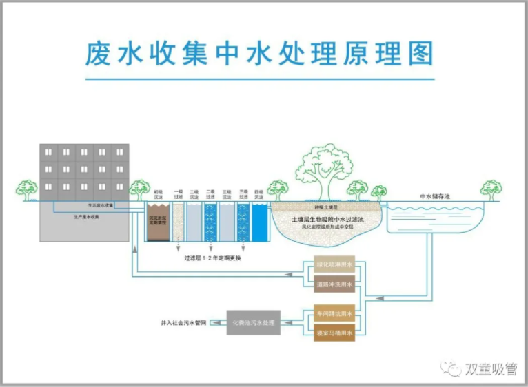2020年年初,“雙童”二期新廠房投入使用,廢水收集中水回用系統(tǒng)在原來(lái)“雙童”一期廠房的基礎(chǔ)上進(jìn)行了大量的優(yōu)化和提升,讓員工日常生活中所產(chǎn)生的廢水不僅得到循環(huán)利用,而且還消滅了企業(yè)的廢水排放和污染,同時(shí)還為企業(yè)節(jié)省了大量水費(fèi)支出! “雙童”二期新廠區(qū):廢水收集中水處理原理圖 “雙童”二期新廠區(qū)節(jié)能降耗設(shè)計(jì)圖