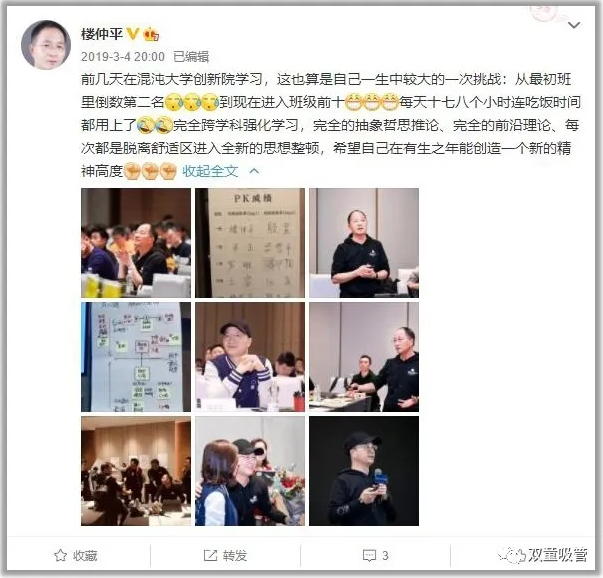 2016年年底,樓仲平在偶然間經(jīng)人介紹,接觸到了混沌大學(xué),聽過幾堂課后,他深刻認(rèn)同混沌的知識(shí)理念,便果斷開通了混沌大學(xué)的線上學(xué)籍。從此,樓仲平開始了更加迅猛和快速的迭代成長。
