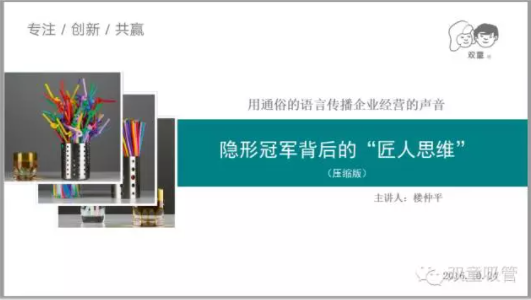 公司二樓,樓仲平正在打造的“吸管博物館”裝修已經(jīng)接近尾聲。他希望能通過這個窗口,不僅展示吸管的歷史與動態(tài),更多的是讓工匠精神傳承下去,成就百年企業(yè)。 “如今中國的制造業(yè)不缺規(guī)模,缺的正是精益求精的品質(zhì)?!痹跇侵倨娇磥?,做企業(yè)是一個鏈?zhǔn)桨l(fā)展過程的持續(xù)積累,需要看得長遠(yuǎn),需要從長計議,需要耐得住寂寞,需要持續(xù)堅守和專注,更需要扎根于內(nèi)心的“匠人之心”。就像他手中這一根吸管,雖然微不足道,但只要挖空心思去做。不去盲目和別人攀比,而是專注于把一件事做到極致,也會有很大的發(fā)展空間。 “做企業(yè)要有一顆‘平常心’,要簡單,有時候甚至要‘一根筋’,企業(yè)家真正把自己精力和心思的90%花在內(nèi)部經(jīng)營和企業(yè)管理上,企業(yè)就自然而然會好起來。”樓仲平說,只有真正把企業(yè)做好了,所謂的名也好、利也罷,那是自然而然的事情,而所有這些特質(zhì)的東西,實際上就是我們要認(rèn)知的“匠人之心”,也就是現(xiàn)在社會極力在倡導(dǎo)的“工匠精神”。 樓仲平講課PPT截圖