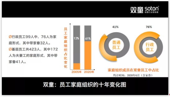 2004年9月開始,雙童就明確把中國傳統(tǒng)“家文化”作為員工管理的著力點,鼓勵員工內(nèi)部戀愛,以“小家”形成“大家”。