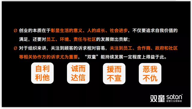 當說起“雙童”為何要持續(xù)堅持“利他經(jīng)營”時,樓仲平答:“雙童”善待員工、善待生態(tài)、善待環(huán)境、善待他人,不是因為有錢了才良心發(fā)現(xiàn)才道德回饋,而是懂得“利他而利己”的邏輯關系,實際是:唯有持續(xù)對員工好,企業(yè)才會持續(xù)發(fā)展!