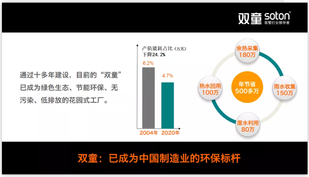 早在2004年,樓仲平就受日式企業(yè)科學管理的啟發(fā),引進了雨水收集回用系統(tǒng)、廢水處理回用系統(tǒng)、設備余熱水循環(huán)利用系統(tǒng)、設備余熱采集循環(huán)系統(tǒng),2005年,“雙童”就開始采用垃圾分類循環(huán)系統(tǒng)。
