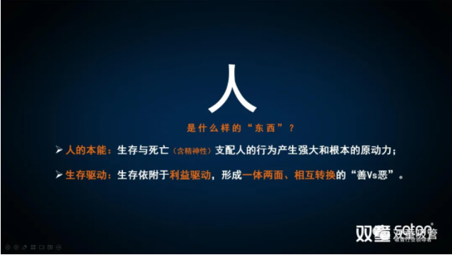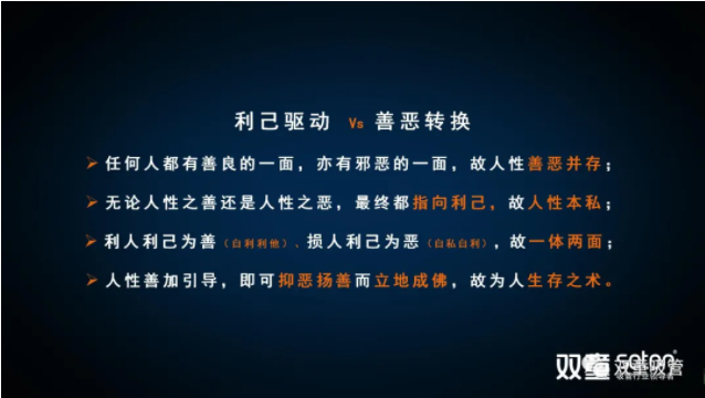 從上圖中大家可以看到,無論人性之善還是人性之惡,其實(shí)都包含“利己驅(qū)動(dòng)”。“利己”是人在長(zhǎng)期的自然環(huán)境中為了獲得生存不得不獲得更多外部資源的內(nèi)在驅(qū)動(dòng)力,從而導(dǎo)致人總是會(huì)從利己的角度去考慮如何更快、更多的獲得。所以“人性本私”是無可非議的。