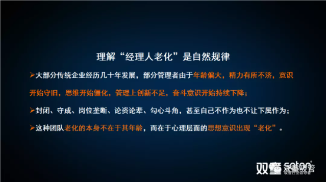 接下來,樓老師通過“雙童”十年前的案例闡述“雙童”遇到的“經(jīng)理人老化”問題: