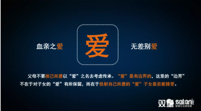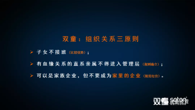 雙童在組織變革后明確形成了“組織關(guān)系三原則”,很多人不理解樓老師在十年前做出的“子女不接班”這樣的傳承安排,樓老師引導(dǎo)大家在傳承問題上沒有絕對(duì)的答案,雙童不讓子女接班并非我大公無私,而是運(yùn)用經(jīng)濟(jì)學(xué)的“比較優(yōu)勢(shì)”原理充分酌量后選擇的結(jié)果,是綜合考慮了子女的喜好、擅長(zhǎng)、愿景后而得出的合理安排。當(dāng)然期間隱含的信號(hào)卻發(fā)出了巨大的想象空間。大家想想,在一家經(jīng)營(yíng)了近二十年的傳統(tǒng)制造企業(yè)里面: