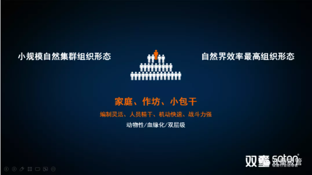 樓老師通過蟻群、猴群、魚群等自然界案例和思維邏輯圖,向大家展現(xiàn)了自然界當(dāng)中普遍存在的自然組織形態(tài)。這種基于動(dòng)物性、血緣化本能而形成的雙層結(jié)構(gòu)的組織形式由于其編制靈活、人員精干、機(jī)動(dòng)快速而戰(zhàn)斗力強(qiáng),是自然界當(dāng)中存在億萬年之久的十分高效的組織形態(tài)。