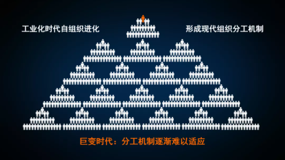 數(shù)字化環(huán)境下“人”的改變導(dǎo)致信息獲取的方式持續(xù)改變,信息的扁平化傳播讓每個(gè)人都能獲得更有效率的信息獲取方式,信息的非對(duì)稱環(huán)境幾乎被消滅,組織成員的心智急速提升,認(rèn)知方式劇烈改變,原有的工業(yè)時(shí)代分工管理機(jī)制逐漸難以被成員所接受,經(jīng)歷百年完善的分工管理機(jī)制在數(shù)字化環(huán)境下逐漸難以適應(yīng)巨變環(huán)境帶來的持續(xù)挑戰(zhàn)。