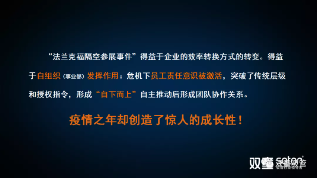 隨后,樓老師通過“法蘭克福隔空參展事件”,讓大家深刻意識(shí)到這種機(jī)制催生的巨大活力。“雙童”第三事業(yè)部在2020年2月疫情危機(jī)下,自主經(jīng)營(yíng)的員工責(zé)任意識(shí)被激活,在眾多不利環(huán)境下突破了傳統(tǒng)層級(jí)和授權(quán)指令,實(shí)現(xiàn)“自下而上”推動(dòng)后形成了緊密的團(tuán)隊(duì)協(xié)作關(guān)系。在眼看參展無望的絕境下竭盡所能,核心成員通過創(chuàng)新方式和遠(yuǎn)程視頻控的方式聘請(qǐng)德國(guó)慕尼黑工業(yè)大學(xué)的留學(xué)生全程參展,從而獲得了五年以來最好的參展效果,在疫情之年取得了驚人的成長(zhǎng)性。