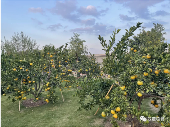 為了“雙童”的生態(tài)和美觀,公司明確柚子是觀賞性水果。成長(zhǎng)過(guò)程中柚子可以一直掛在樹(shù)上觀賞一直到第二年四月,六月份開(kāi)始新的柚子又長(zhǎng)成了,一年掛果十個(gè)月!每棵柚子樹(shù)上都有“觀賞水果,請(qǐng)勿摘食”的字樣,提醒和引導(dǎo)員工不要摘食觀賞水果。