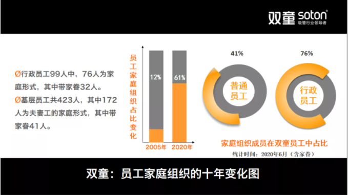 “雙童”在“家文化”推行過程當(dāng)中,讓員工能夠安心地在公司工作、生活、戀愛,形成了濃厚的“家文化”氛圍!直到現(xiàn)在,已經(jīng)有140個(gè)家庭在“雙童”落戶,其中最多的一家有11個(gè)人住在公司。其中,有的把父母和孩子接過來一起照料,也有單身漢在“雙童”找到人生伴侶,擁有了幸福的家庭。