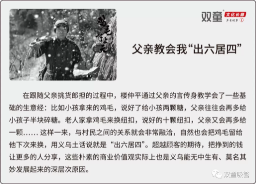 雖然現(xiàn)在義烏人早已不從事“雞毛換糖”,但無論做生意還是辦企業(yè),都延續(xù)了這一價(jià)值觀,這實(shí)際上也是義烏能發(fā)展得越來越好的深層原因。