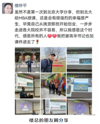 許多了解“雙童”樓仲平的人都知道:樓仲平初中尚未畢業(yè)就開始挑貨郎擔(dān),他是憑借后天的超強(qiáng)學(xué)習(xí)力,不斷地學(xué)習(xí),不斷地進(jìn)行自我迭代。本次北大講課結(jié)束之后,他也在朋友圈寫下一段肺腑之言:感謝這個(gè)時(shí)代,感謝所有的人!