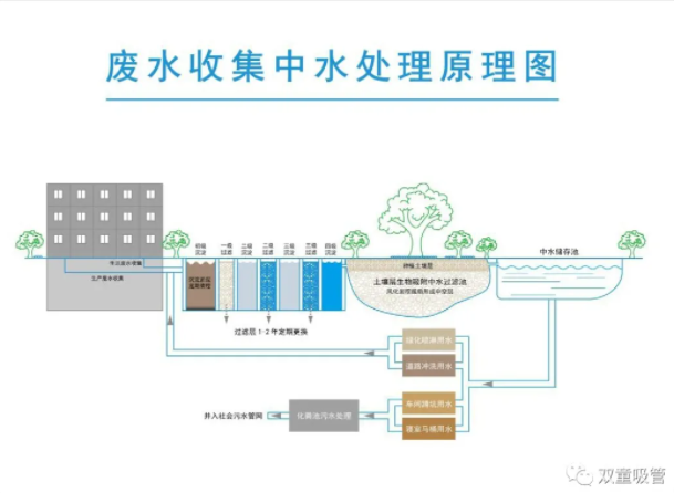 所謂的廢水收集中水回用系統(tǒng)其實(shí)就是:在員工生活區(qū)的衛(wèi)生間內(nèi)鋪設(shè)管道,將員工洗臉、洗澡、洗衣服所產(chǎn)生的廢水通過管道匯集,用細(xì)沙、細(xì)木炭、石英砂、活性炭等進(jìn)行隔離過濾和技術(shù)處理,處理過后的水會(huì)流入專門的中水儲(chǔ)存池中。
