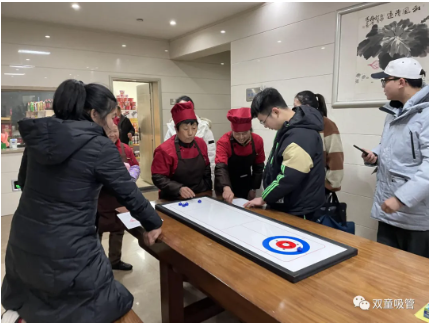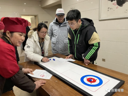 桌上冰壺看起來不大,難度系數(shù)卻爆表了!吸管妞試過幾次都沒能成功,一下子對冰壺這個游戲肅然起敬了然而,讓吸管妞感到意外的是,“雙童”的“選手們”卻紛紛在游戲現(xiàn)場大顯神通,讓妞大開眼界!