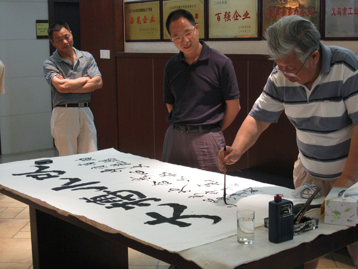 2009年5月12日,國家一級美術(shù)師醒醉、原名沈芳(教援),應(yīng)公司董事長樓仲平先生的邀請來我司現(xiàn)場揮毫,迎來眾多書畫愛好者觀看。大師結(jié)合公司董事長多年以來堅持的經(jīng)營理念和公司產(chǎn)品及企業(yè)文化特點,揮筆寫下《以小博大》、《胸懷》和《遠(yuǎn)瞻》等名作,并同樓仲平先生現(xiàn)場合影.