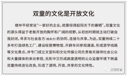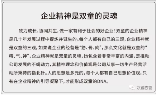 企業(yè)文化是在長期的經(jīng)營活動中形成的,是對企業(yè)成長環(huán)境、能力、經(jīng)驗的歸納與變革,伴隨著企業(yè)的歷史而生。那么“雙童”的企業(yè)文化是如何傳承和進(jìn)化的呢?