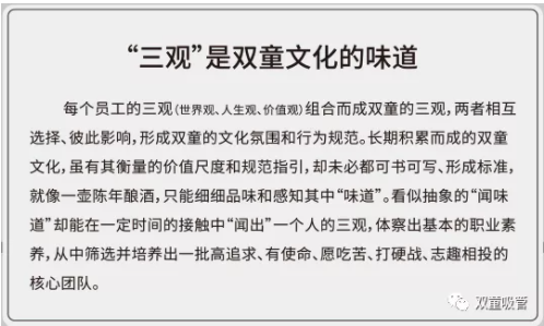 如何引導(dǎo)員工及團(tuán)隊形成良好的價值觀、世界觀及人生觀,這是企業(yè)文化中的“三觀”。“雙童”的“三觀”是由每員工的“三觀”組合而成,兩者互選擇、彼此影響,長期積累成“雙童”的文化氛圍和行為規(guī),最終打造出了一批高追求、有使命、愿吃苦、打硬戰(zhàn)、志趣相投的核心團(tuán)隊。