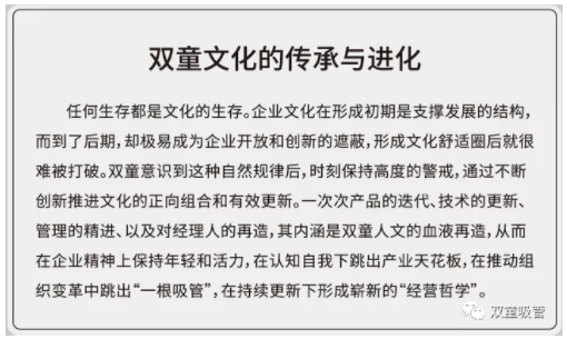 一次次產(chǎn)品的迭代、技術(shù)的更新、管理的精進(jìn)、以及對經(jīng)理人的再造,其內(nèi)涵是“雙童”人文血液造就,從而在企業(yè)精神上保持年輕和活力,在認(rèn)知自我下跳出產(chǎn)業(yè)天花板,在推動組織變革中跳出“一根吸管,在持續(xù)更新下形成嶄新的“經(jīng)營哲學(xué)