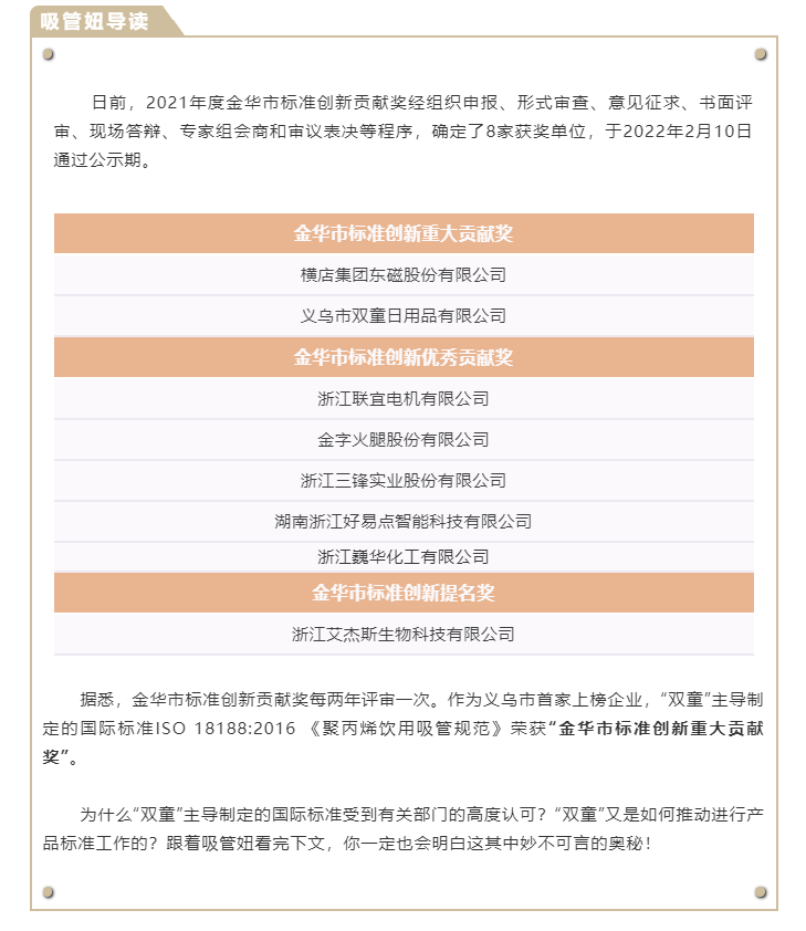 開年重磅喜訊 | “雙童”獲得義烏首家“金華市標(biāo)準(zhǔn)創(chuàng)新重大貢獻(xiàn)獎(jiǎng)”!“一根吸管”也可以如此精彩!