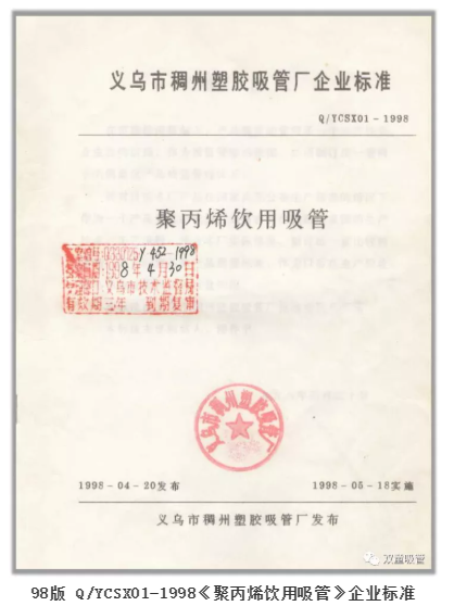 終于在1997年10月,由“雙童”前身的義烏市稠州塑膠吸管廠起草的《聚丙烯飲用吸管》企業(yè)標(biāo)準(zhǔn)順利通過審核,于1998年4月正式發(fā)布,成為吸管行業(yè)最早的產(chǎn)品標(biāo)準(zhǔn)。從此,“雙童”打開了產(chǎn)品在商超場所的銷售渠道,實(shí)現(xiàn)了傳統(tǒng)家庭作坊企業(yè)向正規(guī)工廠的轉(zhuǎn)型。