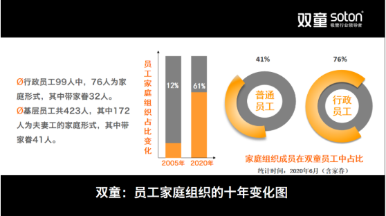 “雙童”在“家文化”推行過程當中,讓員工能夠安心地在公司工作、生活、戀愛,形成了濃厚的“家文化”氛圍!直到現(xiàn)在,已經(jīng)有140個家庭在“雙童”落戶,其中最多的一家有11個人住在公司。其中,有的把父母和孩子接過來一起照料,也有單身漢在“雙童”找到人生伴侶,擁有了幸福的家庭。