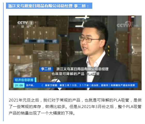 2021年元旦之后,我們對于常規(guī)的產品,也就是可降解的PLA吸管,是做了一些常規(guī)的庫存,做得比較多。但是從2021年3月份之后,整個PLA吸管產品的銷量出現了一個大幅度的下降。