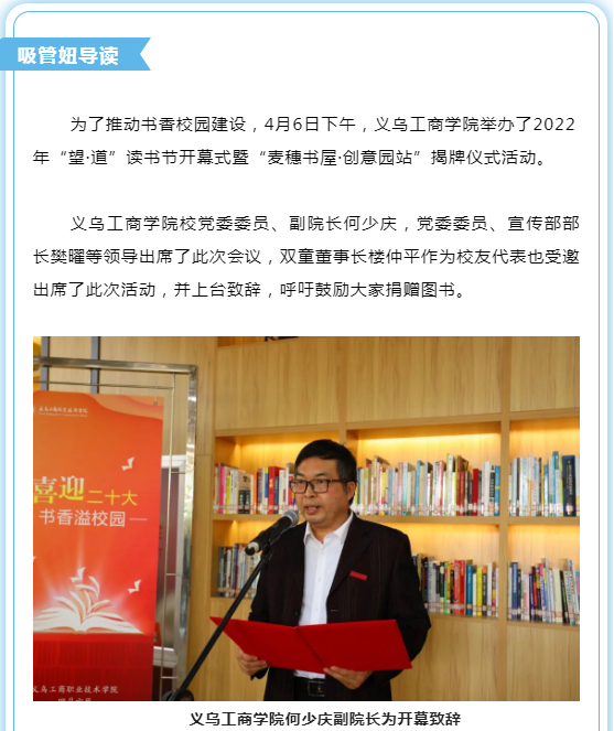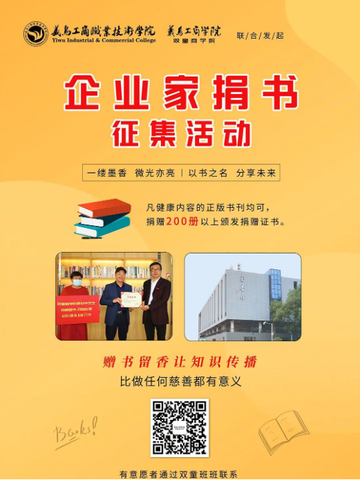 為學(xué)生帶來(lái)“好書(shū)近在咫尺,知識(shí)觸手可及”的學(xué)習(xí)環(huán)境,義烏工商學(xué)院和雙童商學(xué)院聯(lián)合發(fā)起“企業(yè)家捐書(shū)征集活動(dòng)”,快來(lái)貢獻(xiàn)出你的一份力量吧!