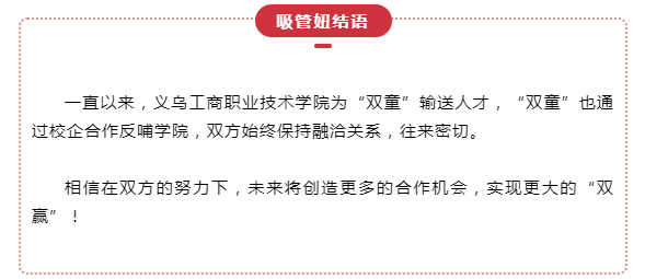 樓仲平指出,校企雙方應(yīng)該發(fā)揮“雙童”在產(chǎn)教融合型企業(yè)開(kāi)展協(xié)同育人、資源整合等方面的獨(dú)特優(yōu)勢(shì)。通過(guò)雙童商學(xué)院構(gòu)建高水平的“產(chǎn)教融合體”,實(shí)現(xiàn)教育和產(chǎn)業(yè)全面融合、形成校企合作可持續(xù)發(fā)展的長(zhǎng)效機(jī)制,優(yōu)化“產(chǎn)、學(xué)、研、培”五位一體模式,打造有特色、有深度、可推廣的校企合作義烏新范式。