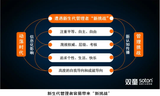 新生代員工的成長環(huán)境塑造了他們的性格,認知方式也會不同于其他時代的人。一旦老板與員工的認知不同,那就很難達成思想同頻,自然會有沖突。這些沖突正是“年輕人不好管”這種觀念產(chǎn)生的源頭。“雙童”用這個方式解答這一沖突:用年輕人去管理年輕人,敢于授權(quán)給年輕人,運用新生代的力量突破巨變時代下企業(yè)發(fā)展的局限。