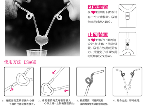 浪漫七夕,有愛心更溫馨~~~也許你輕輕的點(diǎn)擊,獲得的不僅是溫馨浪漫,更多的是時(shí)尚健康。全球獨(dú)創(chuàng)專利新產(chǎn)品“愛心吸管”, 給浪漫的伴侶實(shí)現(xiàn)共享一杯,在濃濃愛意中共吐纏綿,愛心吸管,一起吸出愛的味道!
